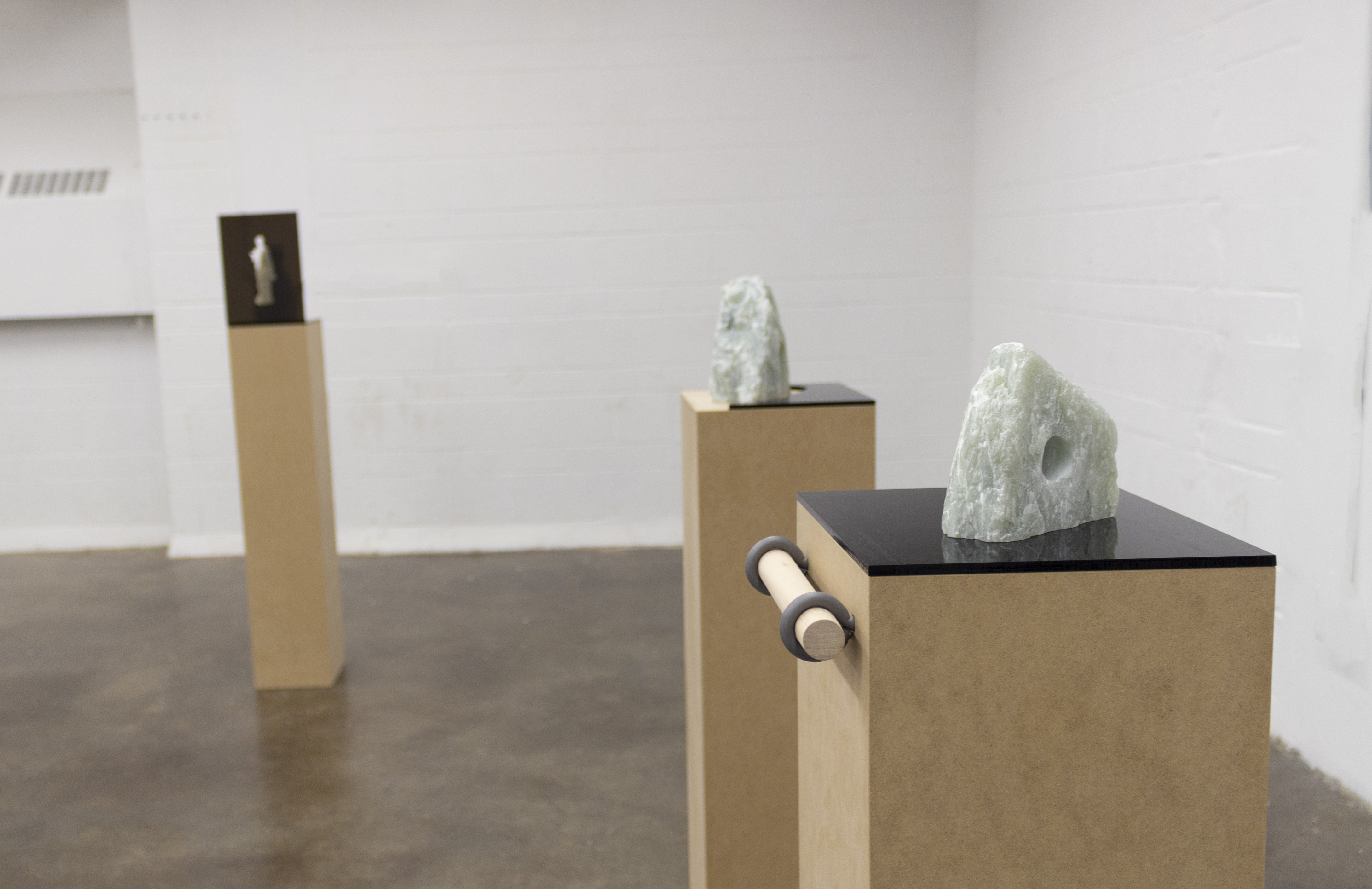 Soapstone, alabaster, bronze tinted acrylic, poplar dowels, steel hardware